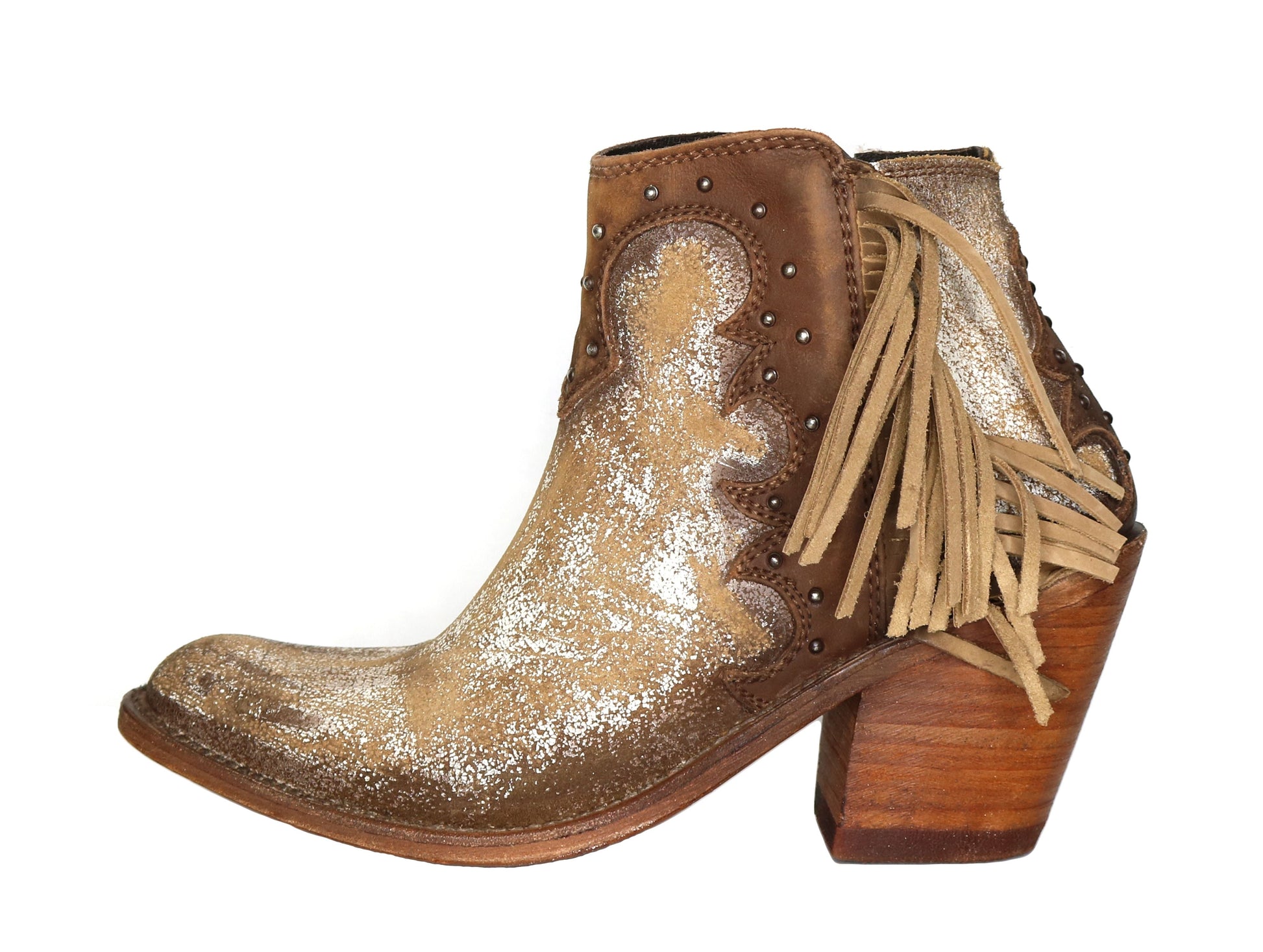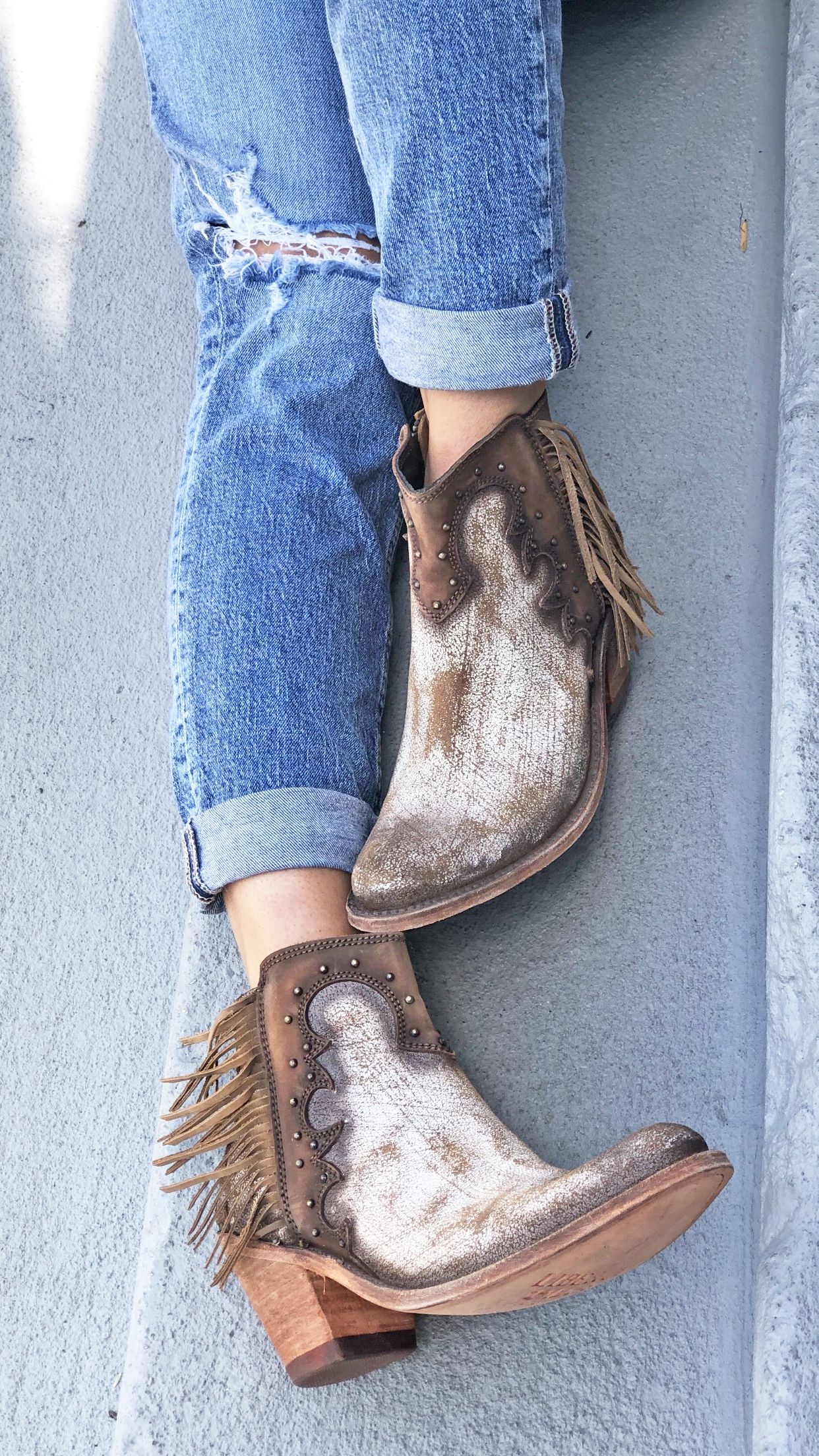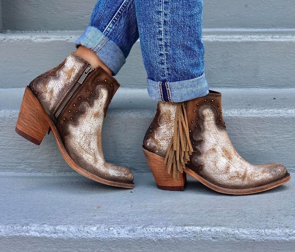 Edgy ankle boots are here from Liberty Black! The Carnaza Cobre Mantequilla is a genuine leather ankle boot featuring a distressed upper fringe trim and stud accents. This rounded toe boot is perfect for the season and pairs great with your denim and dresses!