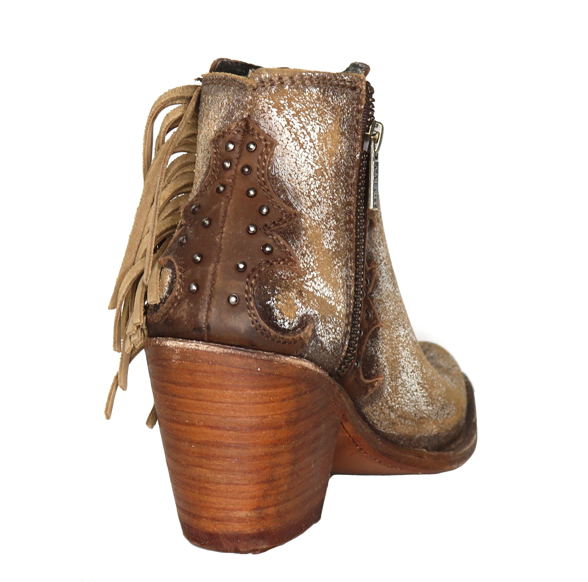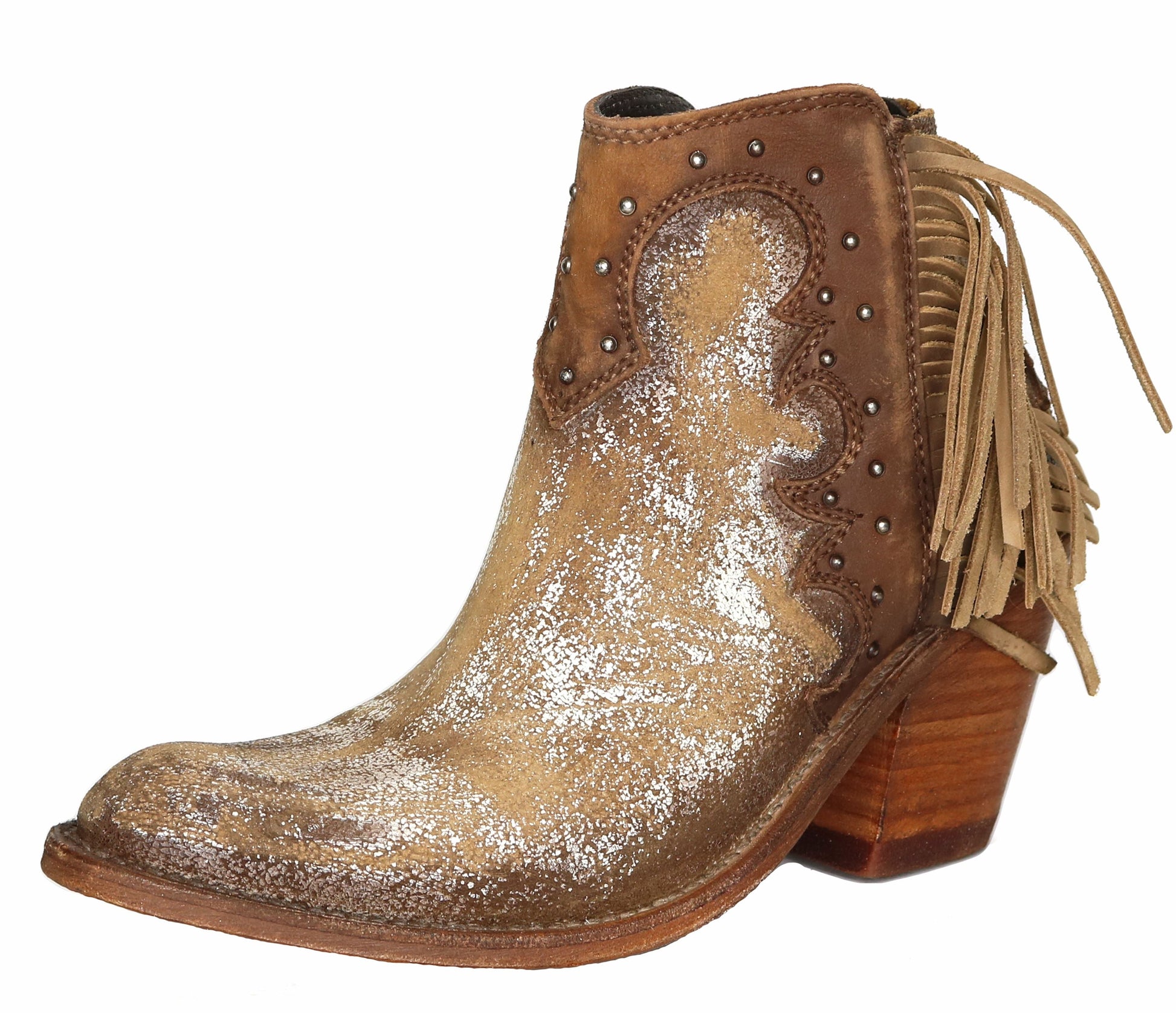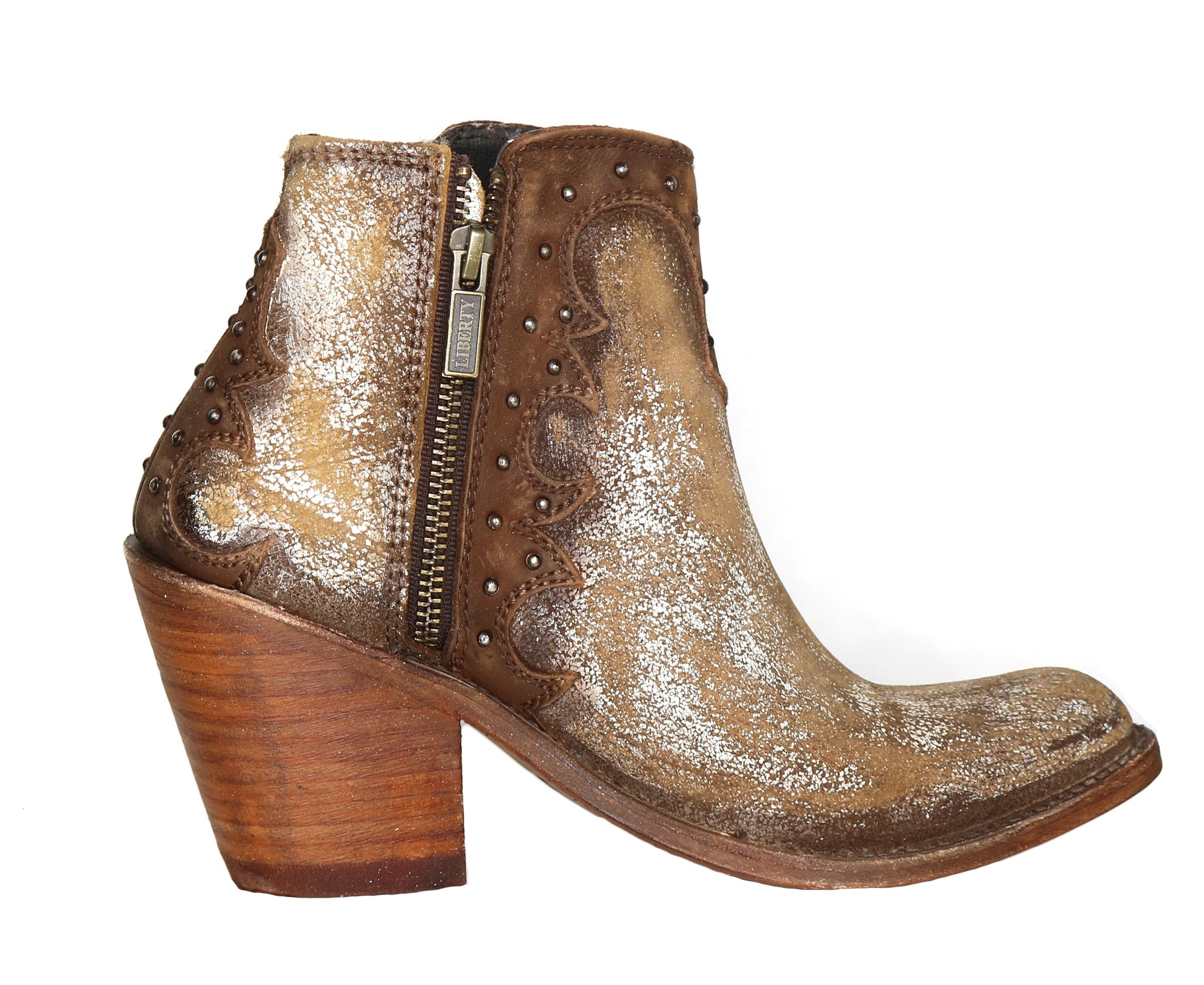 Edgy ankle boots are here from Liberty Black! The Carnaza Cobre Mantequilla is a genuine leather ankle boot featuring a distressed upper fringe trim and stud accents. This rounded toe boot is perfect for the season and pairs great with your denim and dresses!