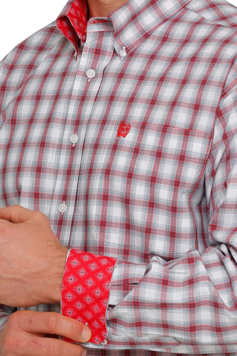 For this classic white CINCH brand button down, we mixed timeless plaid with a trendy geometric contrast trim. Our all-season shirt features an open left front pocket, embroidered logo and white buttons.